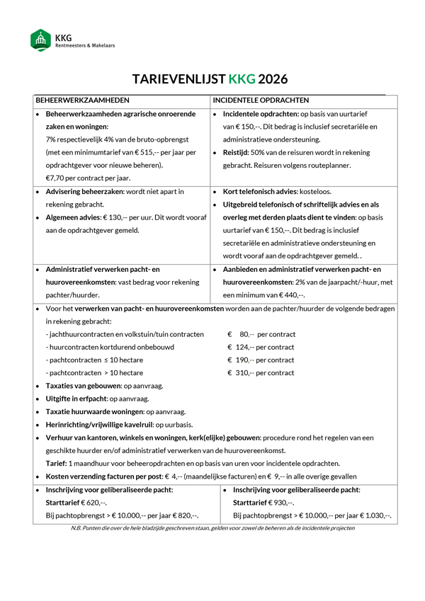 De tarieven voor onze werkzaamheden worden jaarlijks vastgesteld.